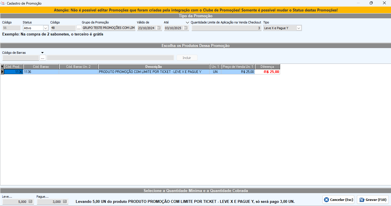 Exemplo: A venda tem 5 itens do produto de código 1 - TESTE, que faz parte de uma promoção com Limite de Aplicação de 4 vezes. Nessa configuração, 4 itens tiveram a promoção aplicada e 1 não. Ao excluir um item que teve a promoção aplicada, será feito um recálculo e a promoção será aplicada no 5º item.