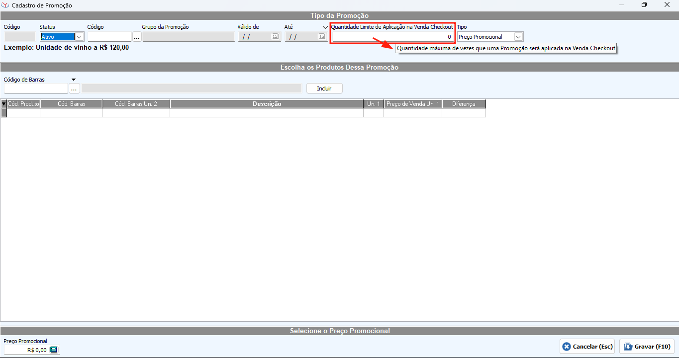 Também foi adicionado o campo "Quantidade Limite de Aplicação na Venda Checkout". Ele só estará visível se o Menu "Venda Checkout" estiver liberado para a empresa.