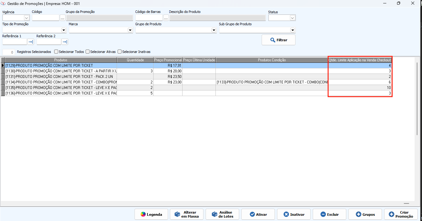 Na tela de Gestão de Promoções, foi adicionado uma nova coluna "Qtde. Limite Aplicação na Venda Checkout". Ela só estará visível se o Menu "Venda Checkout" estiver liberado para a empresa.