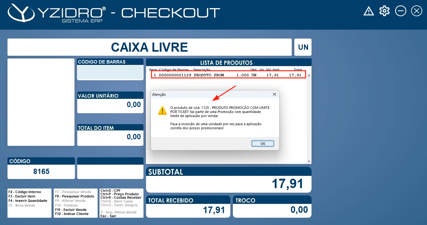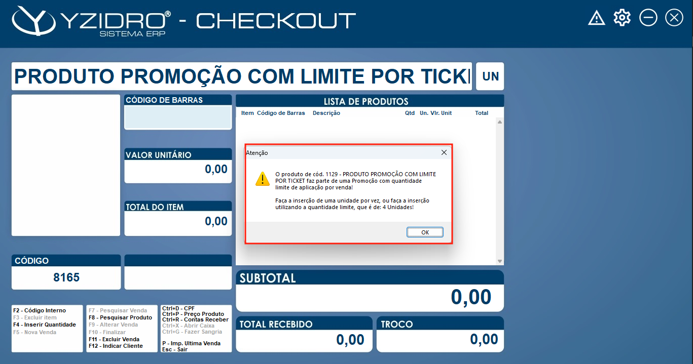 Ao inserir um produto na Venda Checkout, que faça parte de promoção do Tipo “Preço Promocional” ou “Pack de Produtos” e que possua Limite de Aplicação, será possível fazer a inserção "Item a Item" ou informando a “quantidade limite de aplicação”. Caso contrário, a inserção será bloqueada, conforme exemplo da imagem 04.