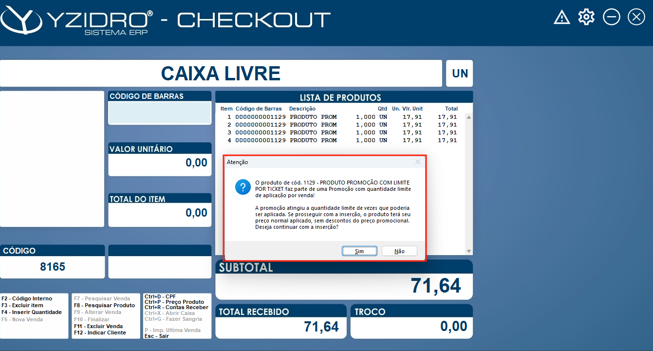 Ao inserir um item que teve o Limite de Aplicação de promoção atingido, o usuário será notificado que o limite foi atingido e que se prosseguir com a inserção, o preço promocional não será mais aplicado.