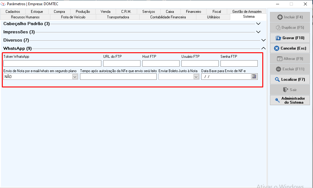 Para a realização dos envios deve-se informar os seguintes parâmetros, presentes em Sistema>WhatsApp, como pode ser observado na Figura 01: