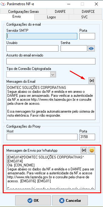 No cadastro de parâmetros de NF-e, que pode ser acessado pelo menu Fiscal>NF-e>Parâmetros (NF-e), foram criados os botões para adicionar variáveis nos textos que serão enviados pelo sistema, e o campo “Mensagem de Envio por Whats”, que será a mensagem que será enviada em caso de envio por WhatsApp, que além da possibilidade de adicionar variáveis, também há a possibilidade de adicionar emojis ao texto , como apresentado na Figura 02