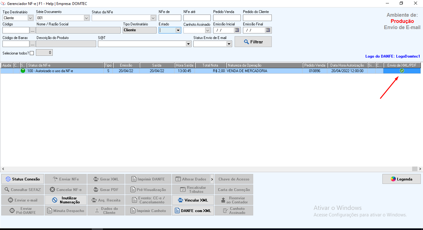 Para saber se o serviço já realizou o envio da nota, basta acessar o menu Fiscal>NF-e>Gerenciar Notas Fiscais Eletrônicas (NF-e), realizar a pesquisa da nota e clicar no campo Envio de XML/PDF, presente na Figura 04, que trará as informações pertinentes ao envio.