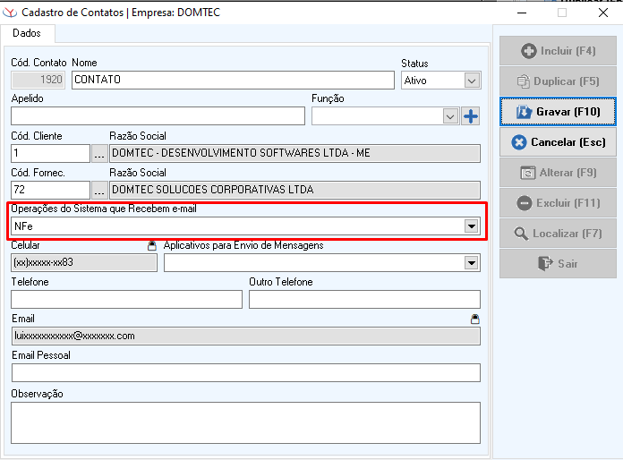 Os contatos que receberão as notas, serão aqueles que estão vinculados ao cliente da nota, e possui no campo “Operações do Sistema que recebem e-mail”, a opção NFe, e o campo “E-mail” e/ou “Celular”, preenchidos, como apresentado na Figura 05.